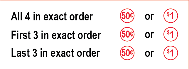 Win cash prizes when your four numbers match some or all of the four numbers in the drawing. Maybe three numbers will match, maybe all four, or maybe just the last two. You can choose up to seven ways they could match, each with different prizes if they do. See below for all the details.