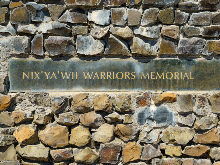 Indigenous veterans and their history are visible all over the Confederated Tribes of the Umatilla Indian Reservation. Outside the Nix-yá-wii Governance Center is the Nicht-Ya-Wi Warriors Memorial. This piece of public art includes a flagpole and lists of names of fallen soldiers from a number of conflicts.